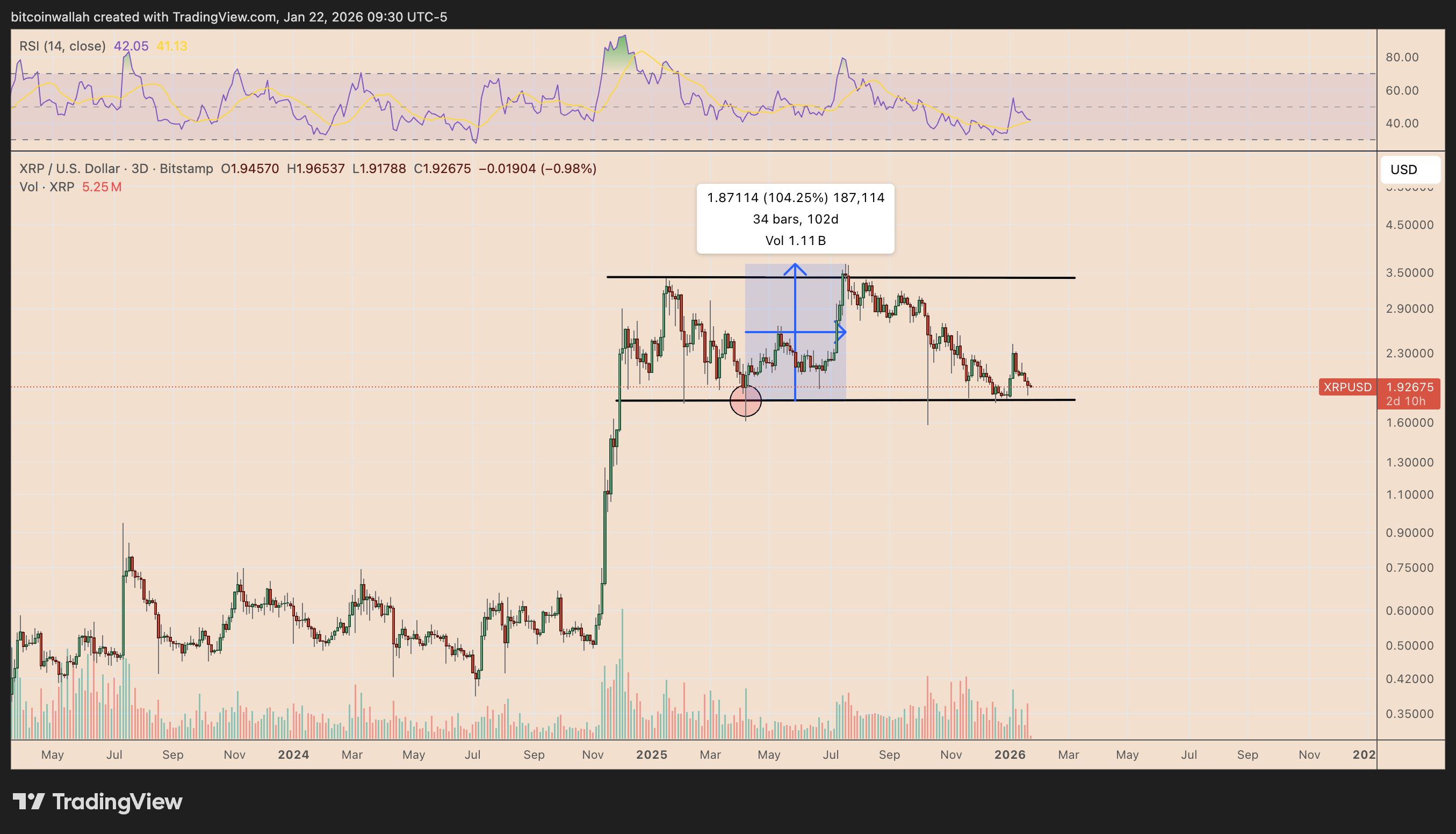 “如果价格开始上涨,这些头寸可能会被清算,从而推动价格上涨。”XRP多头必须将2美元水平恢复为支撑位 截至1月,XRP在测试其长达一年的横盘通道趋势的下轨线后,已小幅反弹,与1.80至2.00美元的支撑区域相吻合。 该区域正是2025年4月推动股价实现100%上涨至3.66美元的起点。